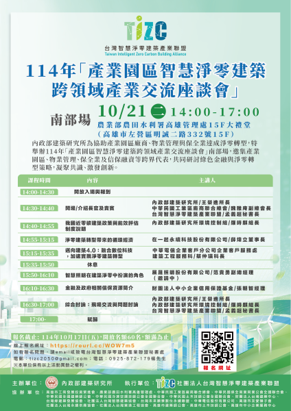 114年產業園區智慧淨零建築跨領域產業交流座談會~現正報名中! 歡迎各界踴躍參加~