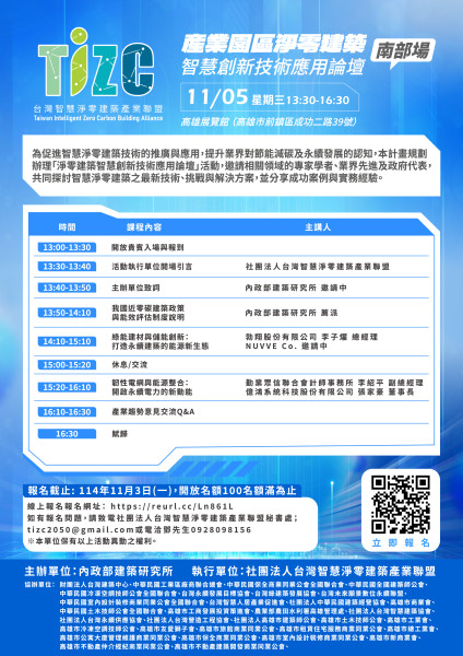 轉知訊息114年「產業園區淨零建築智慧創新技術應用論壇」南部場~現正報名中! 歡迎各界踴躍參加~